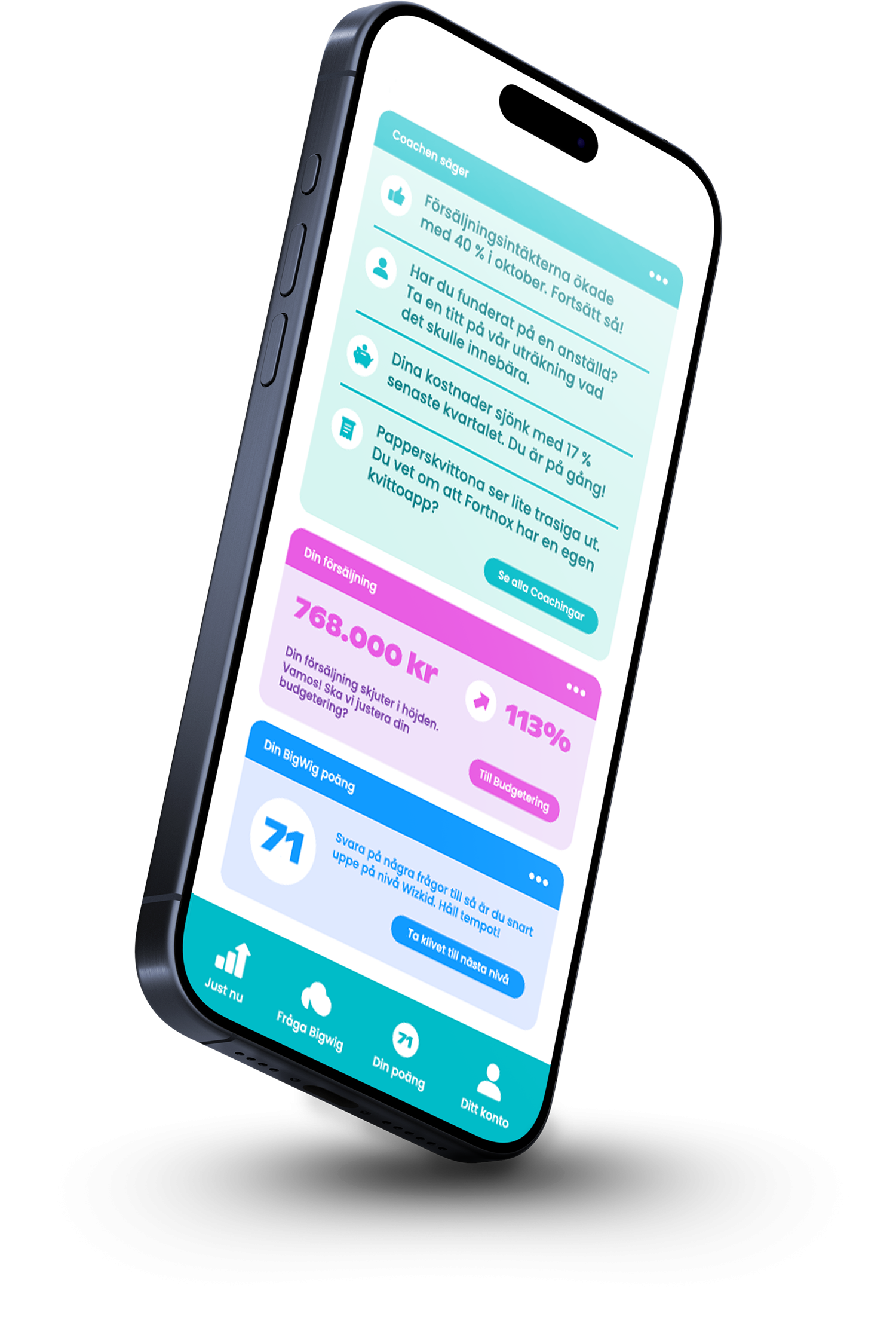 Vi har skapat Bigwig – en AI-kompanjon för små företagare som är din personliga coach, mentor och assistent i ett. Bigwig anpassar sig efter din personlighet, dina mål och din livssituation, samtidigt som den analyserar ditt företags ekonomi via smarta kopplingar till banker, redovisnings system och Skatteverket.